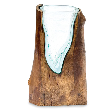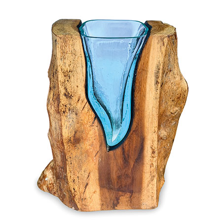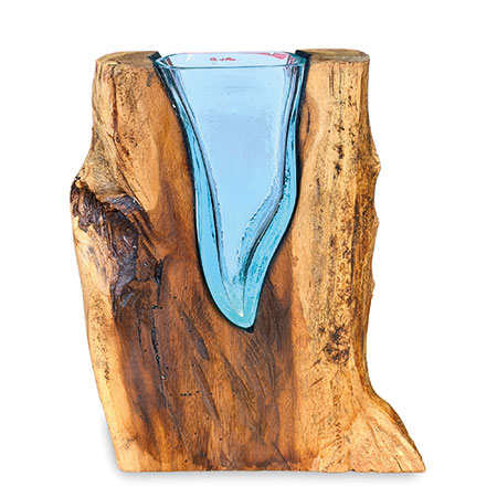 This unique and original vase features recycled glass, hand-blown to fit the natural gap between upturned teak root to produce a removable glass vase.