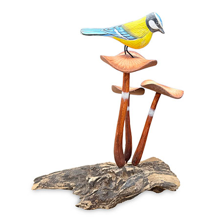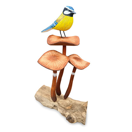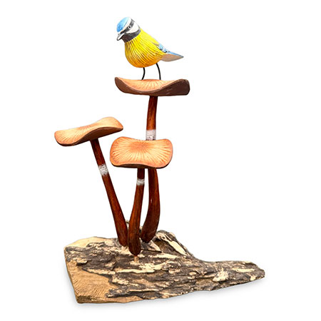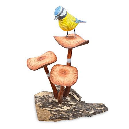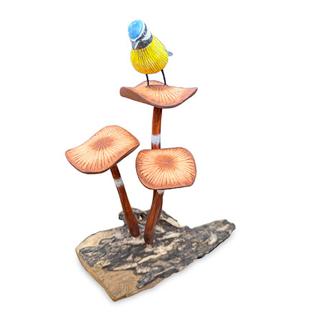 Combining two of our top selling ranges – mushrooms and hand-painted birds, this charming blue tit is perched on a group of hand-carved mushrooms growing from a root base.