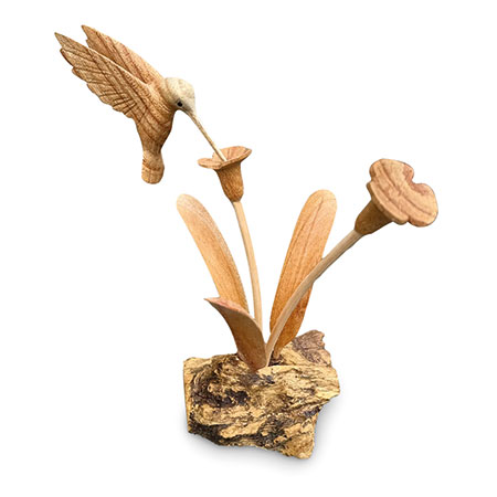Our hand-carved hovering hummingbird sculptures display the natural charm of these gorgeous birds. This sculpture shows a single hummingbird drinking nectar from a flower - single and double hummingbirds feeding from a wooden base also available.
