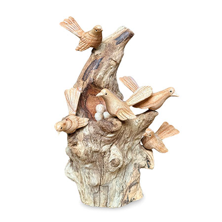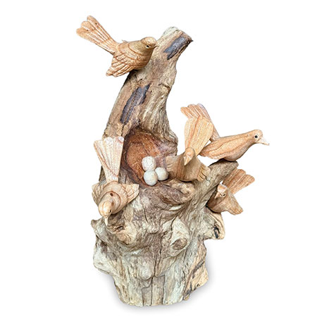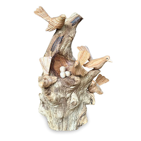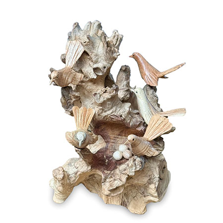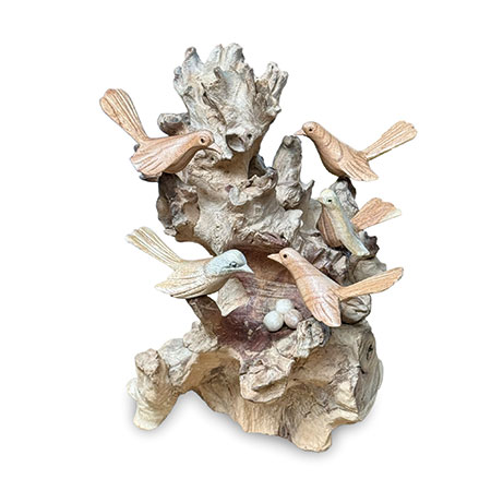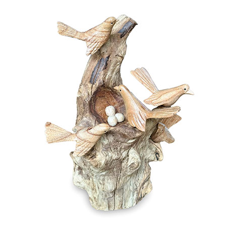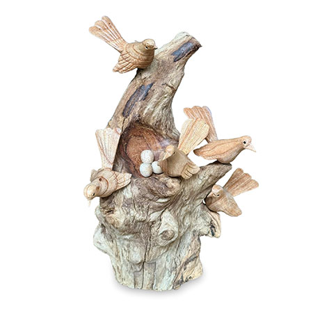 From our nesting birds range - a cute little bird family, all hand-carved from sustainable suar wood, watching over their eggs in a hand-carved nest.