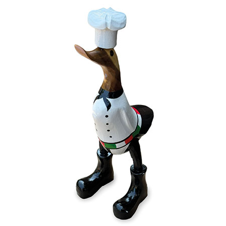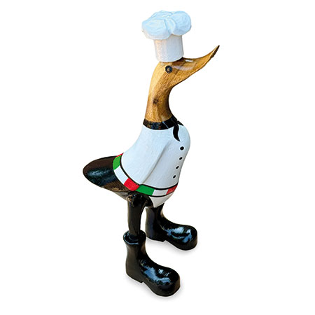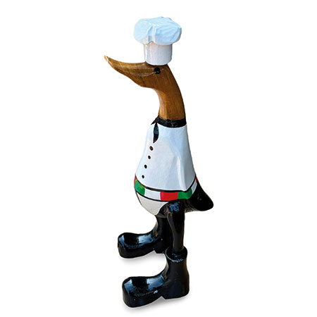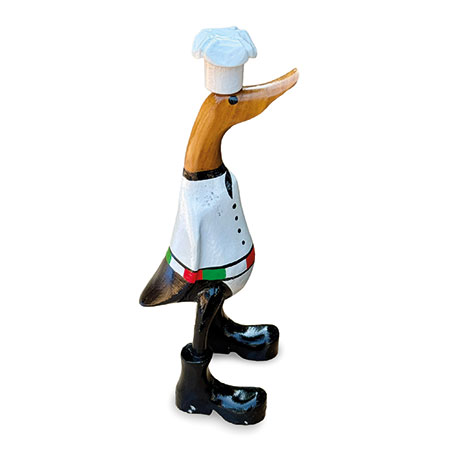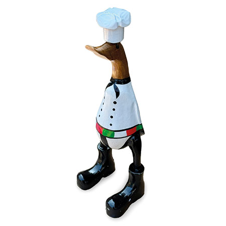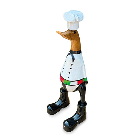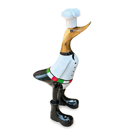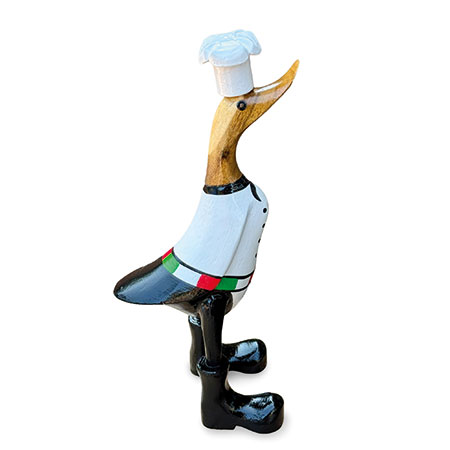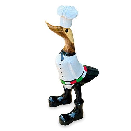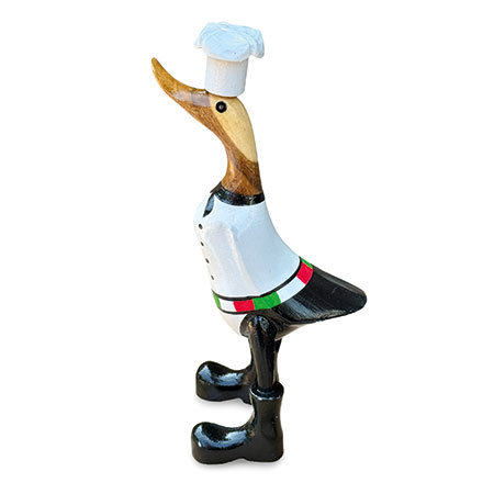 Our hand-painted chef duck is fully kitted out for the kitchen with his chef’s whites and cap. Hand-carved from sustainable bamboo and standing 25cm high.