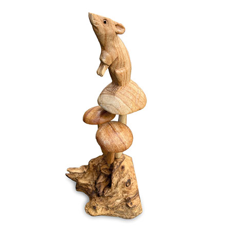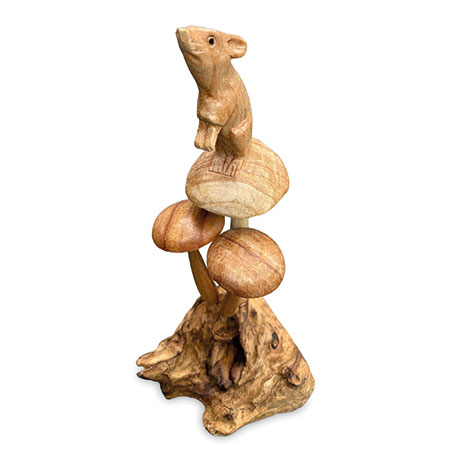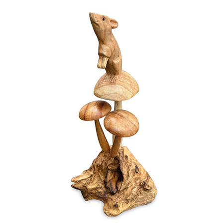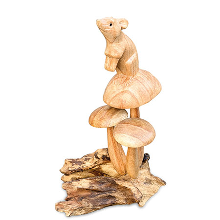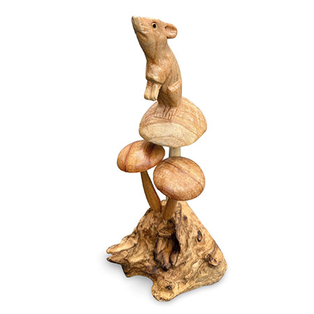 Adorable little mouse, perched on a cluster of mushrooms growing from a wooden base. Hand-carved from sustainable albasia wood.