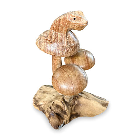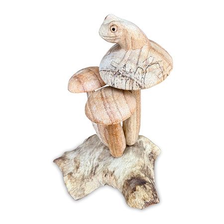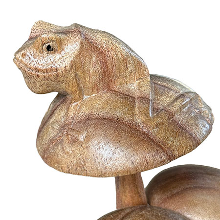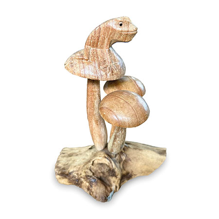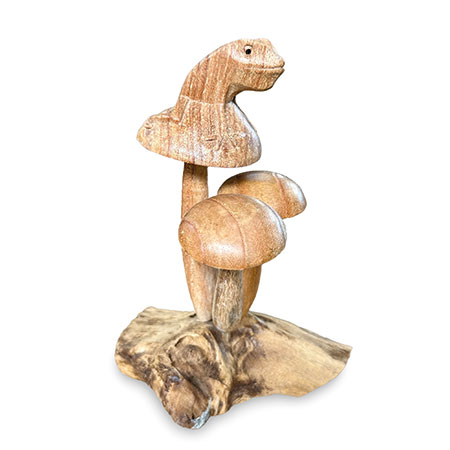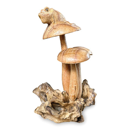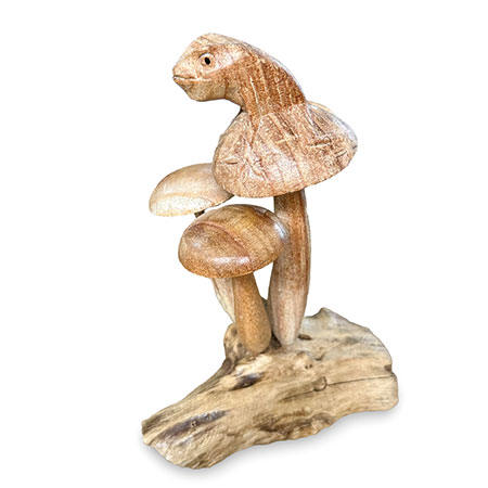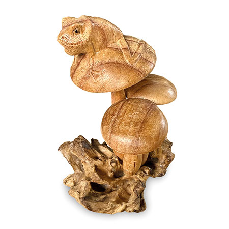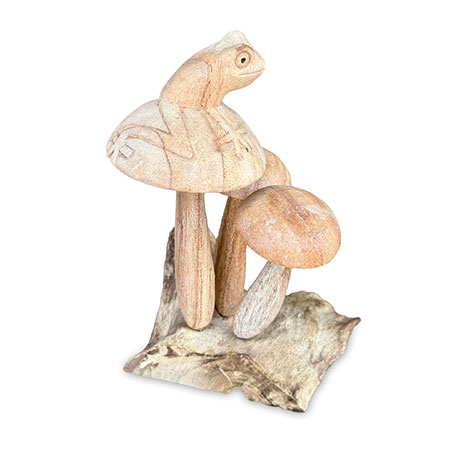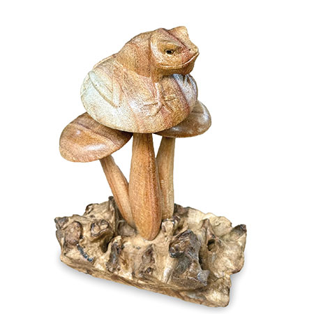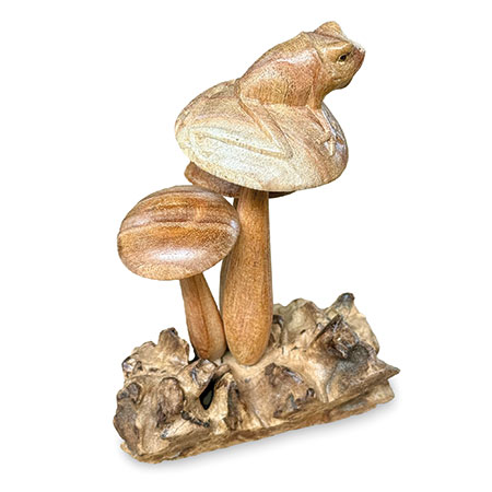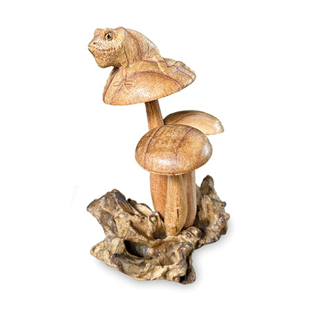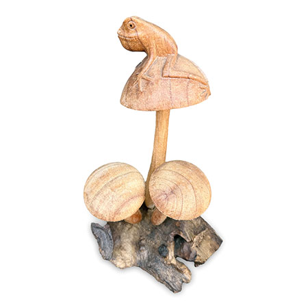 Charming little frog, perched on a cluster of mushrooms growing from a wooden base, just waiting for a passing princess! Hand-carved from sustainable albasia wood.