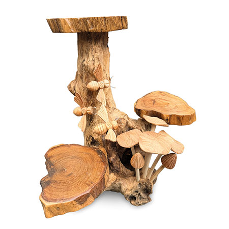 Dinky and versatile mini teak root free-standing shelf unit, only 24cm high. Natural root base with three hand-carved shelves, hand-carved bees and mushrooms.