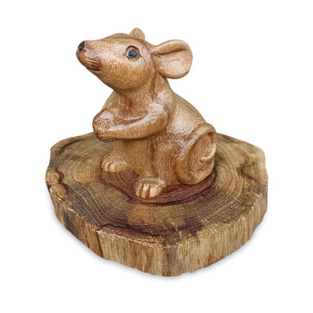 Adorable little mouse, sitting up on its hind legs holding a tasty treat. Hand-carved from suar wood with charming detail.