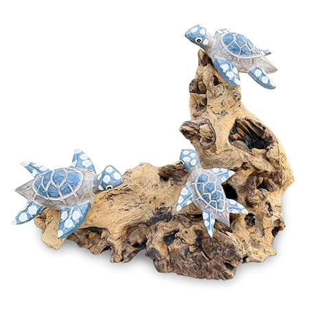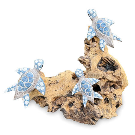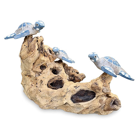 Our three sweet little turtles are hand-carved from sustainable suar wood and adorably hand-painted, swimming around a wooden coral reef.