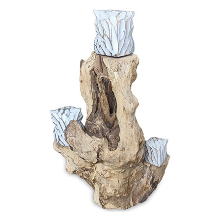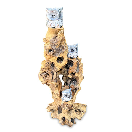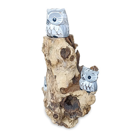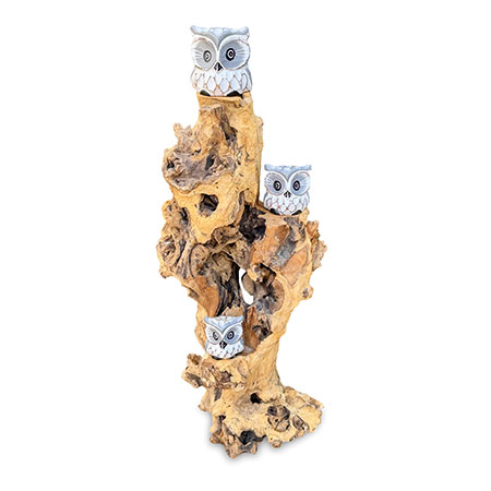 Three adorable baby owls, perched in a teak root tree. Owls hand-carved from suar wood and hand-painted with loveable, cute faces.