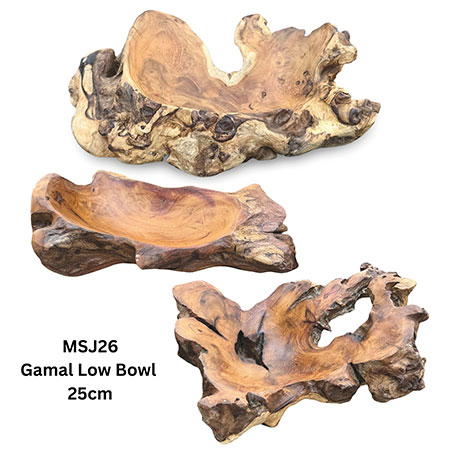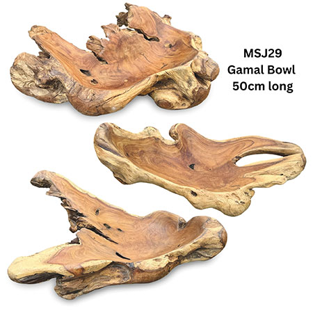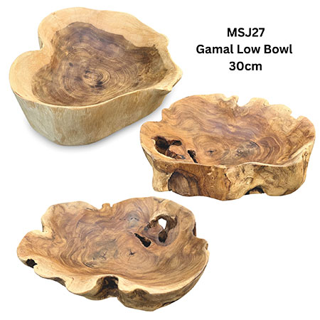Our Gamal bowls are delightfully rustic, made from sustainable Balinese gamal wood with a hand-carved concave centre – fabulously unique and about as far from mass-production as you can get! 40cm wide - different sizes and shapes available.