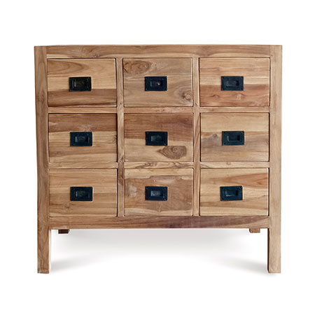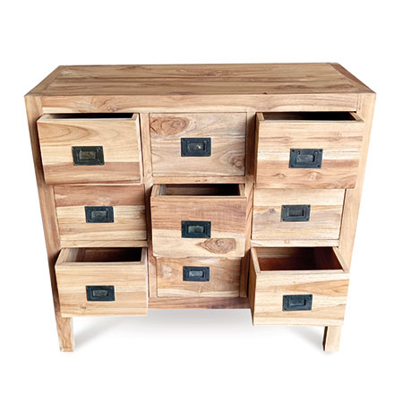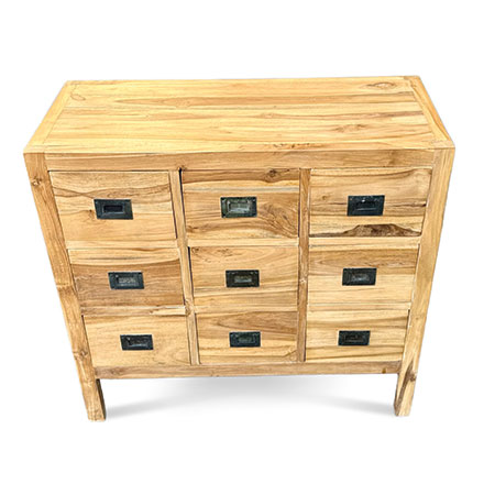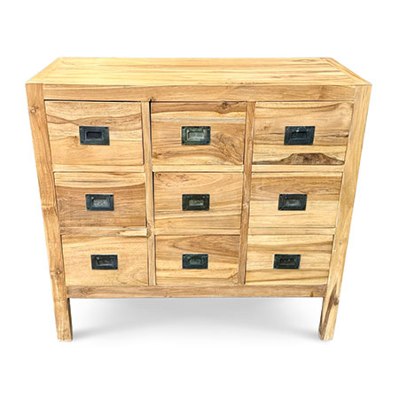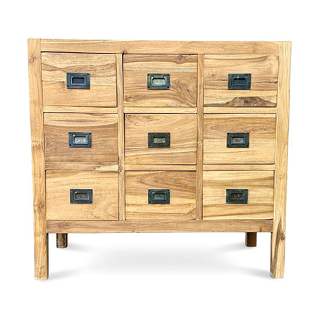 Made by repurposing upcycled and reclaimed wood from discarded teak boats and furniture, our modern-style, hand-carved cabinet is supported by 4 legs and has 9 identical drawers with inset black metal handles on each.