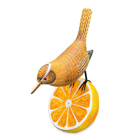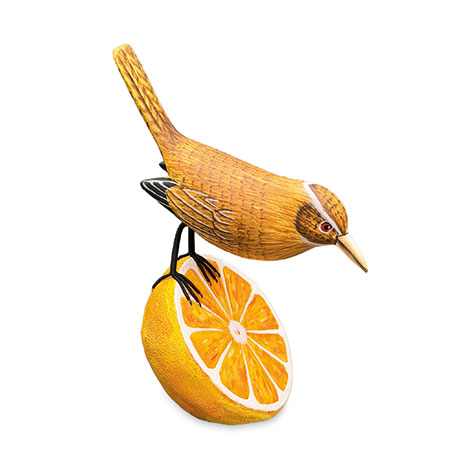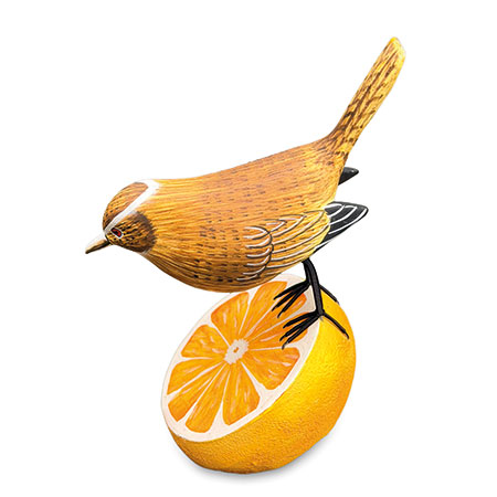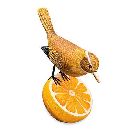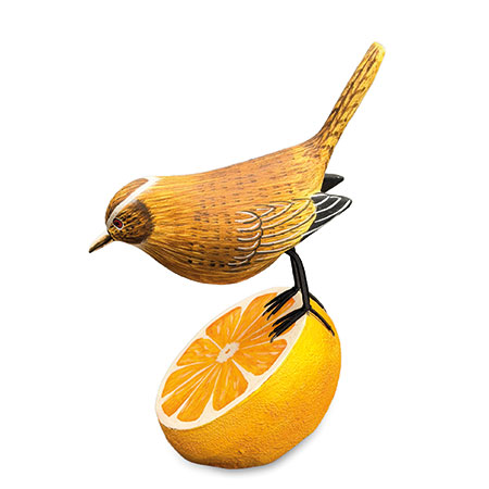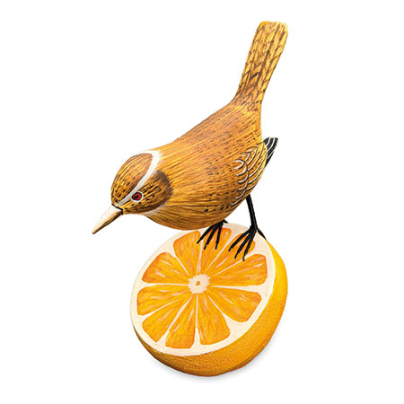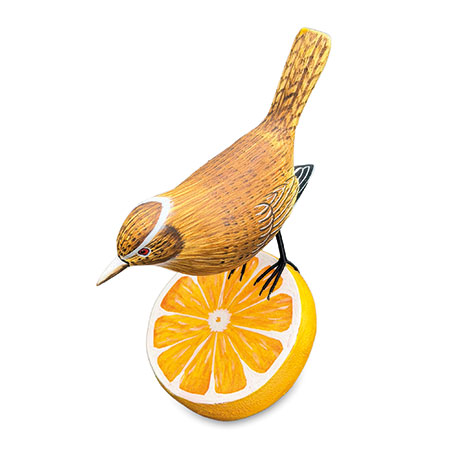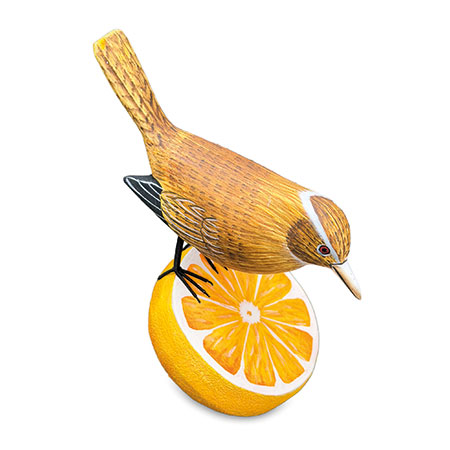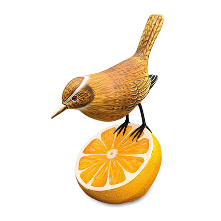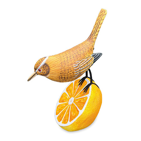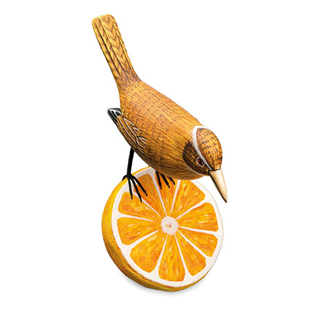 The wren is a common UK garden visitor with a remarkably loud voice for its size. Our adorable little bird is perched on an orange, poised and ready for a munch. Hand-carved from sustainable albizia wood and hand-painted with colourful detail.