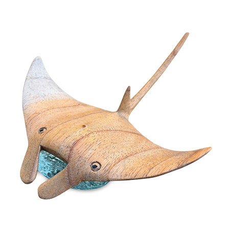 ‘Manta’ is Spanish for ‘blanket’ or ‘cloak’, which makes perfect sense when you see a manta ray gliding along in the ocean. Our hand-carved manta ray is gliding over an ocean of hand-blown recycled glass.