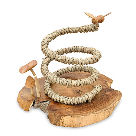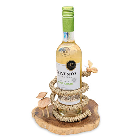 Fabulously original rope wine bottle holder with hand-carved bee and mushroom embellishments. It’s the bee’s knees!