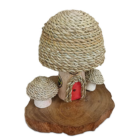 Cute little hand-carved mushrooms with seagrass thatched roofs and door. Hand-painted and hand-embellished – all ready for your favourite fairy to move in. Set on a wooden base.