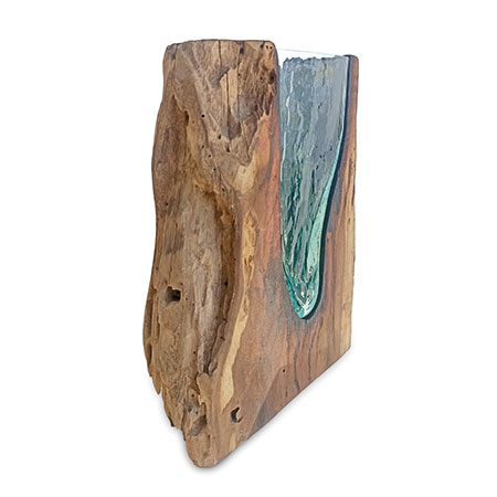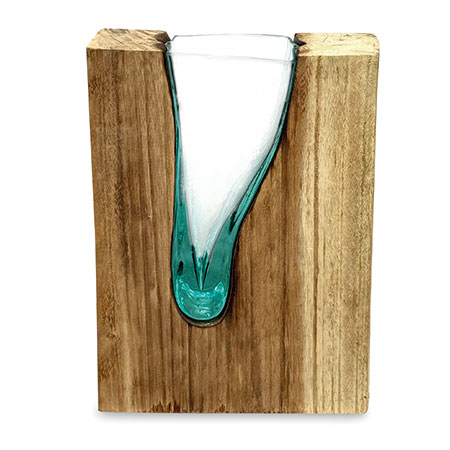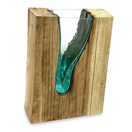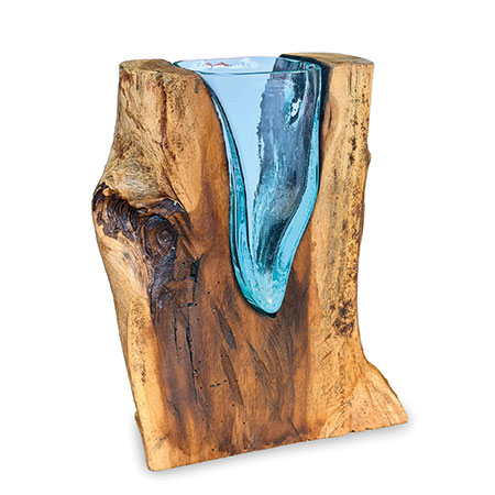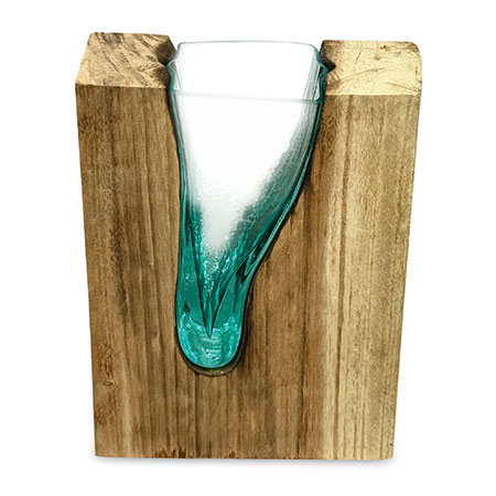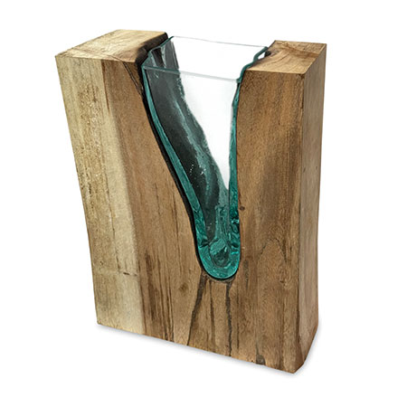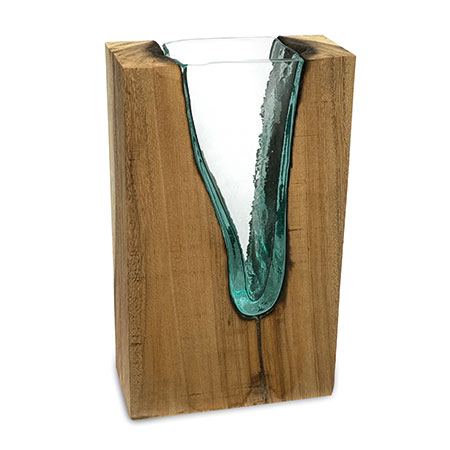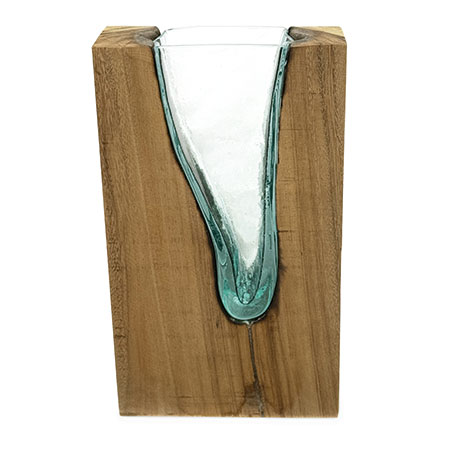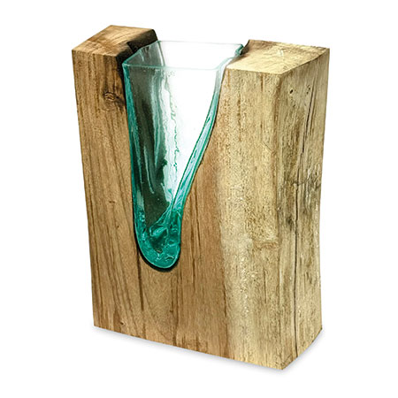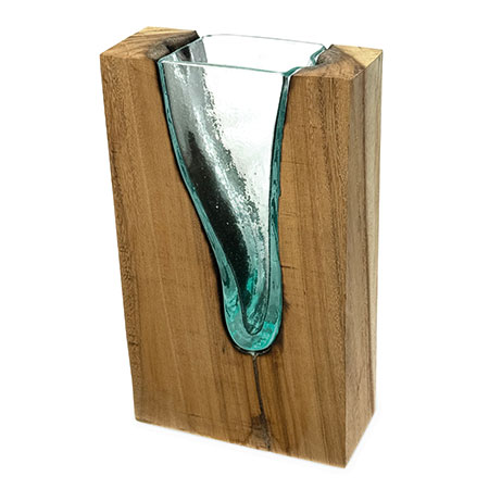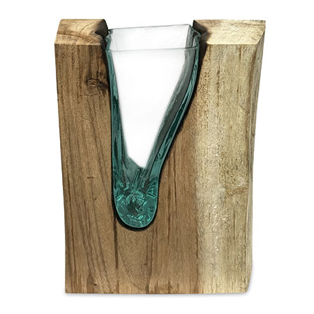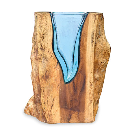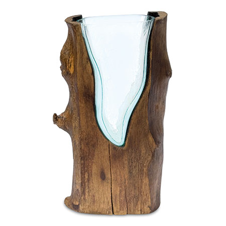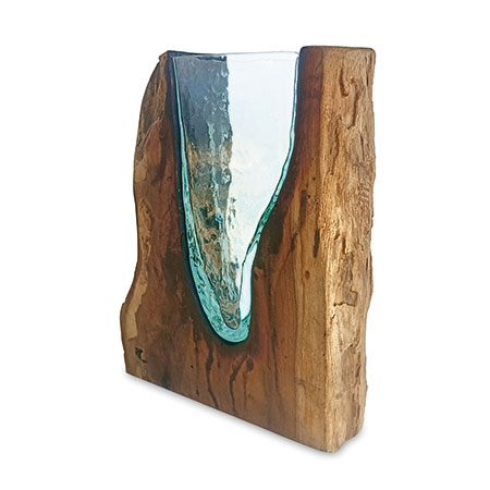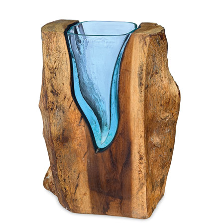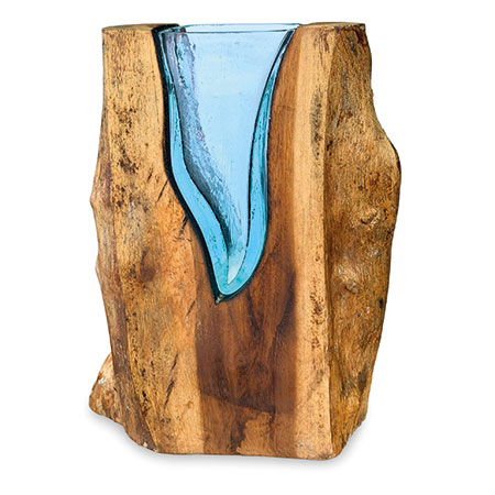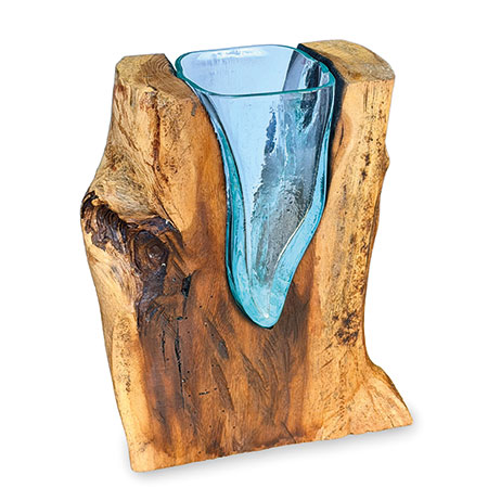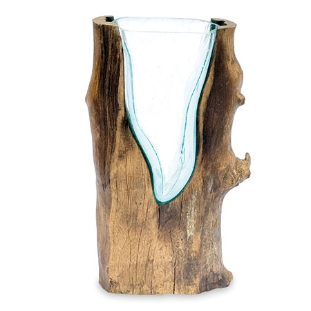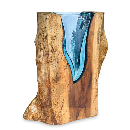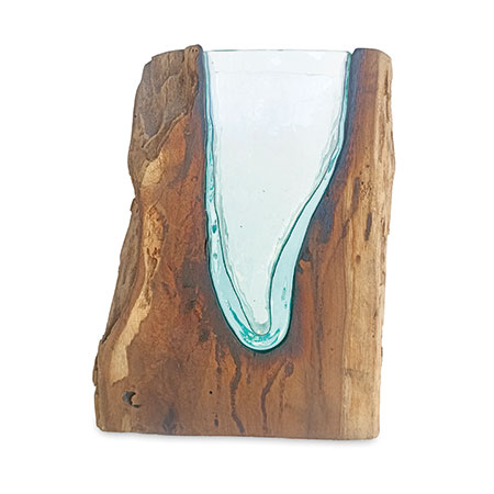 This unique and original vase features recycled glass, hand-blown to fit the natural gap between upturned teak root to produce a removable glass vase.
