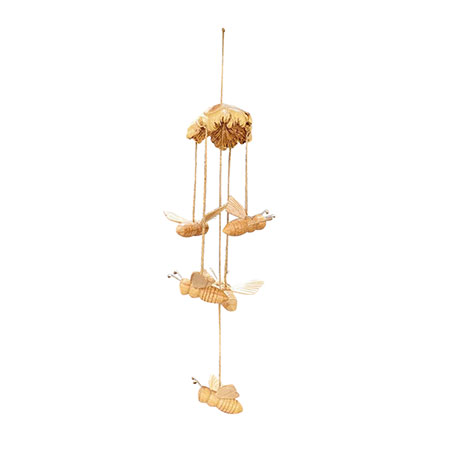 A wind chime that doesn’t annoy the neighbours! Charming mobile with five cute hand-carved bees hanging from a ragged mushroom top.