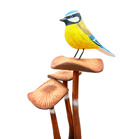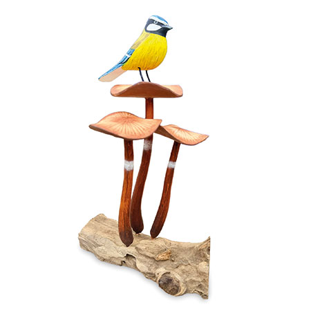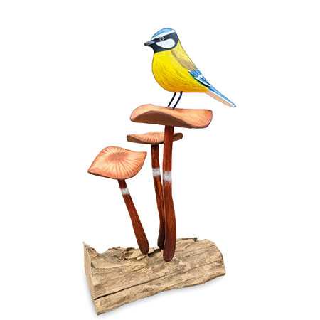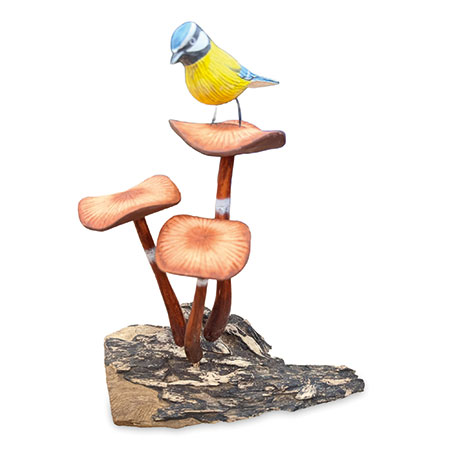 Combining two of our top selling ranges – mushrooms and hand-painted birds, this charming blue tit is perched on a group of hand-carved mushrooms growing from a root base.