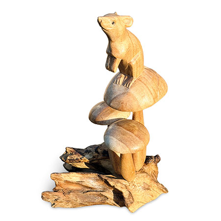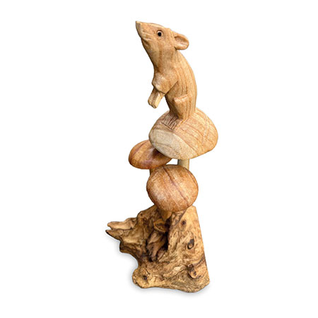 Adorable little mouse, perched on a cluster of mushrooms growing from a wooden base. Hand-carved from sustainable albasia wood.