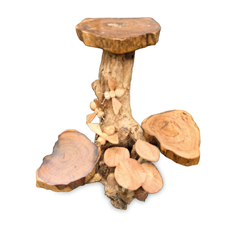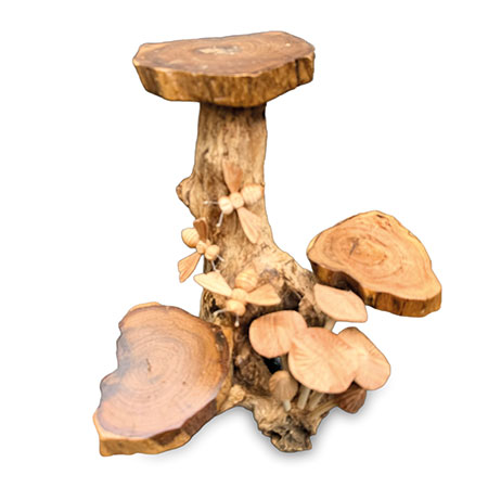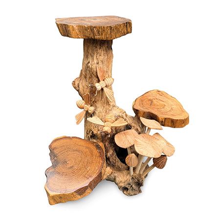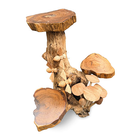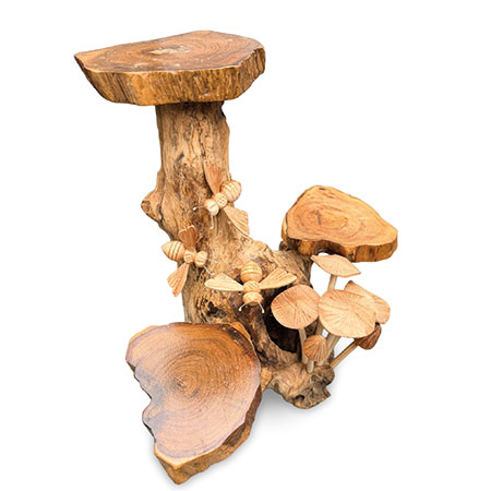 Dinky and versatile mini teak root free-standing shelf unit, only 24cm high. Natural root base with three hand-carved shelves, hand-carved bees and mushrooms.