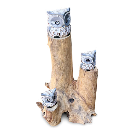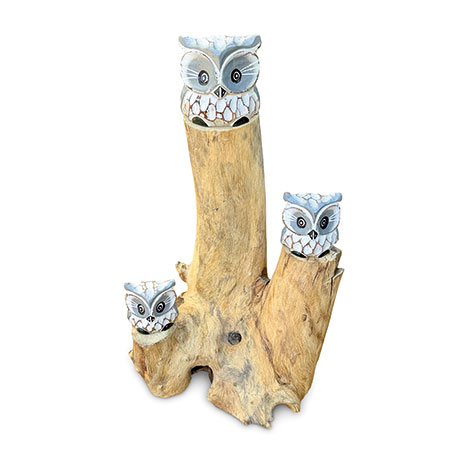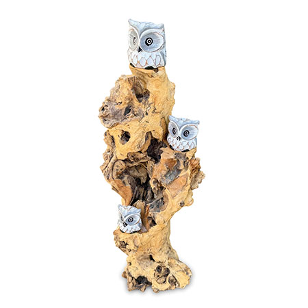 Three adorable baby owls, perched in a teak root tree. Owls hand-carved from suar wood and hand-painted with loveable, cute faces.