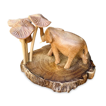 Trumpety-trump it’s Nellie the elephant, stomping along in a forest of mushrooms growing from a wooden slice. Hand-carved from sustainable albasia wood.