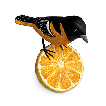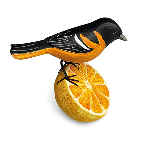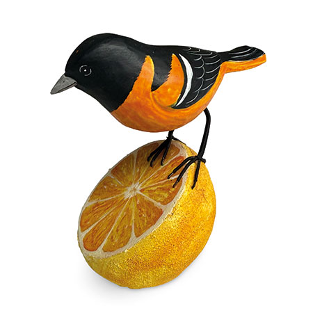 This adorable little bird is perched on an orange, poised and ready for a munch! Hand-carved from sustainable albizia wood and hand-painted with colourful detail.