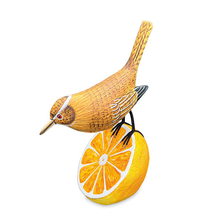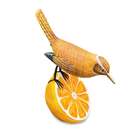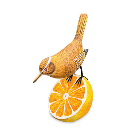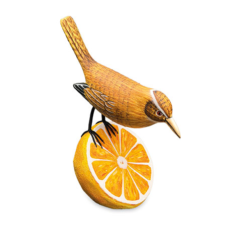 The wren is a common UK garden visitor with a remarkably loud voice for its size. Our adorable little bird is perched on an orange, poised and ready for a munch. Hand-carved from sustainable albizia wood and hand-painted with colourful detail.