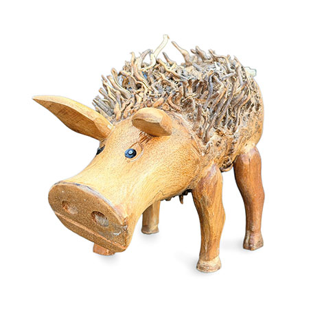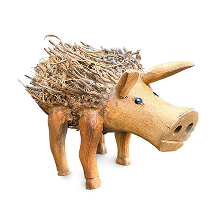 Percy Pig’s fuzzy hair is created by retaining some exposed root fibres – don’t you think he looks handsome?! Hand-carved from teak root with some hand-painted detail.