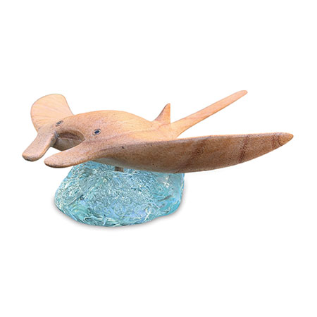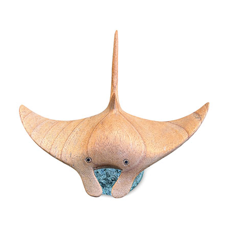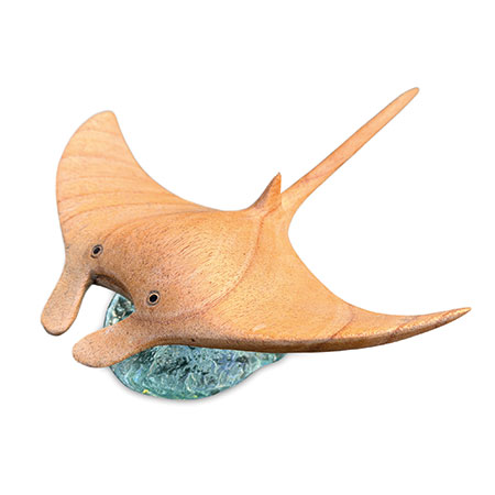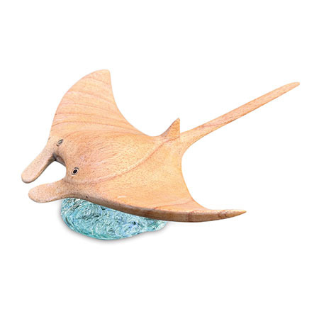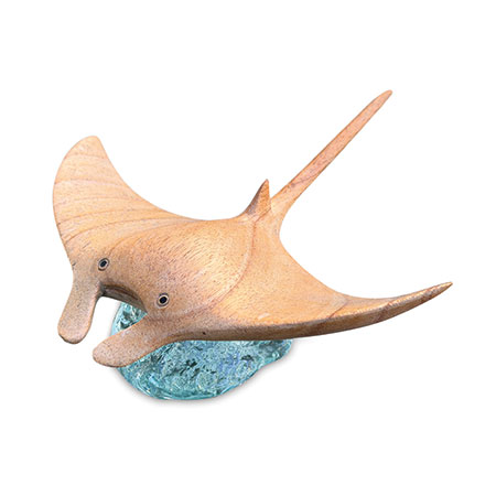 ‘Manta’ is Spanish for ‘blanket’ or ‘cloak’, which makes perfect sense when you see a manta ray gliding along in the ocean. Our hand-carved manta ray is gliding over an ocean of hand-blown recycled glass.
