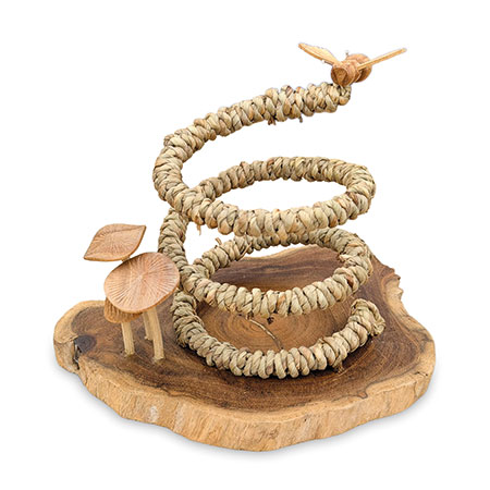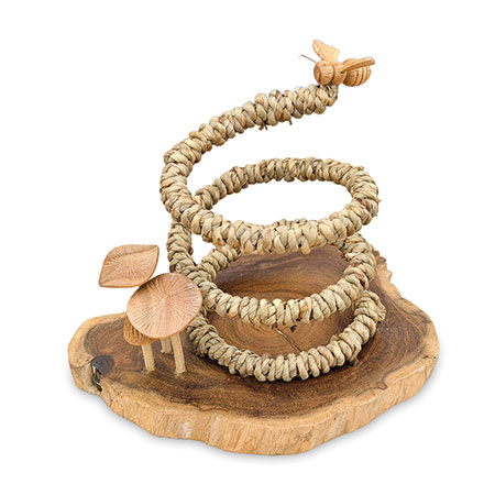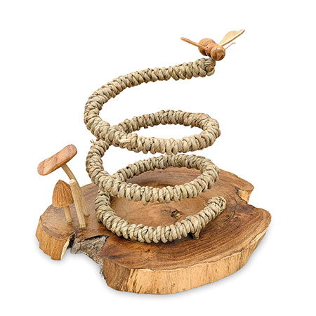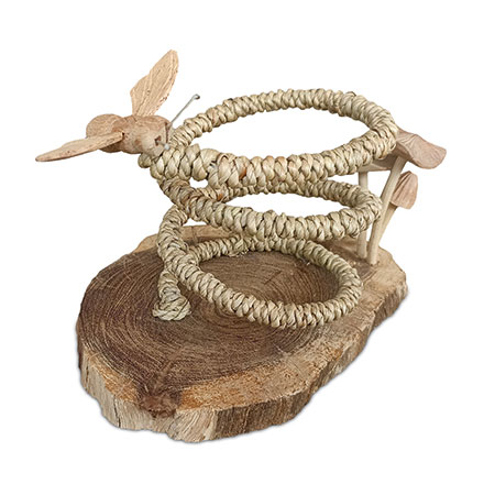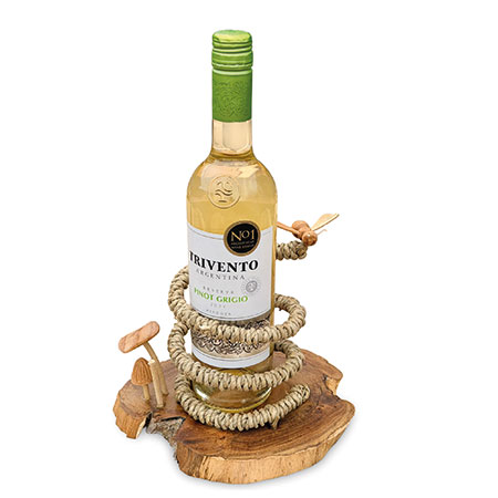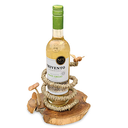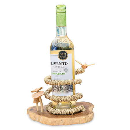 Fabulously original rope wine bottle holder with hand-carved bee and mushroom embellishments. It’s the bee’s knees!