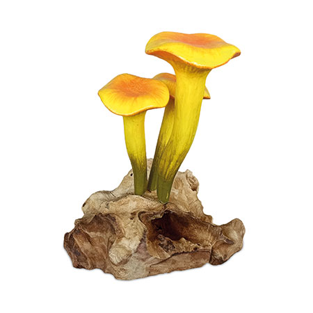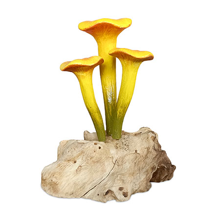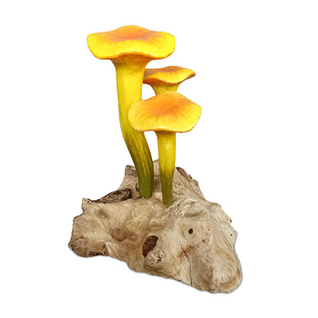 Our painted mushroom sculptures present a range of hand-carved and hand-painted mushrooms inspired by the natural world. This sculpture features 3 glorious yellow chanterelle mushrooms growing from a root base.