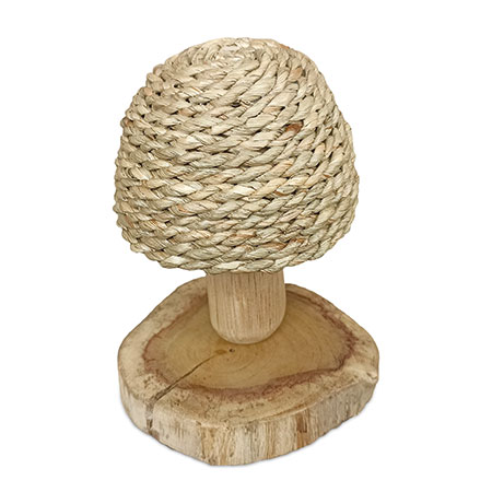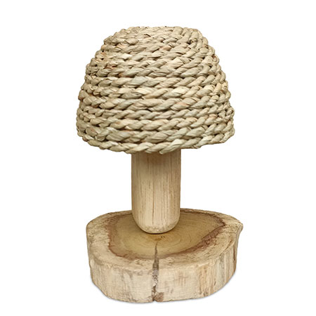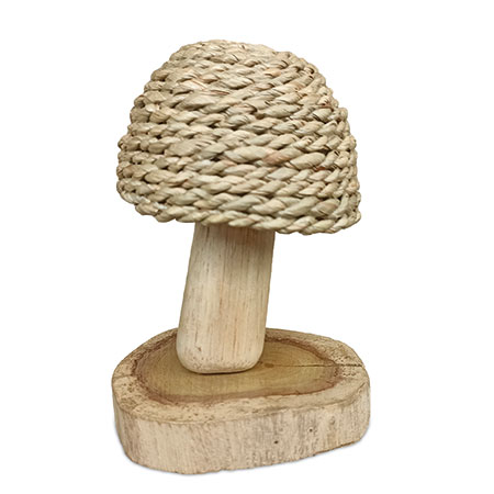 Adorable hand-carved toadstool with its own little thatched roof top. Standing on a sturdy wooden base.