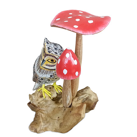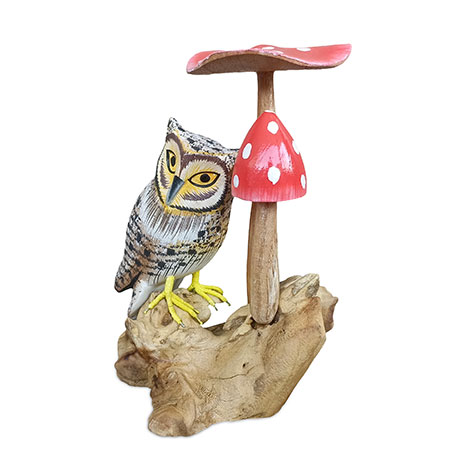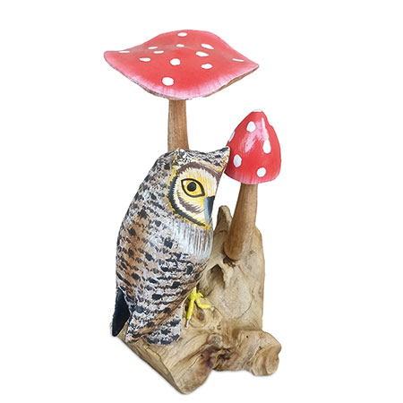 Elegant tawny owl, perched among some toadstools growing from a root base. Hand-carved from sustainable wood with hand-painted detail.