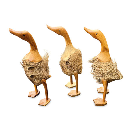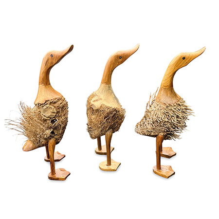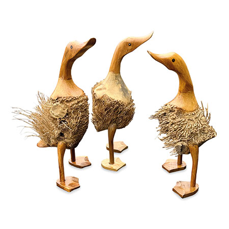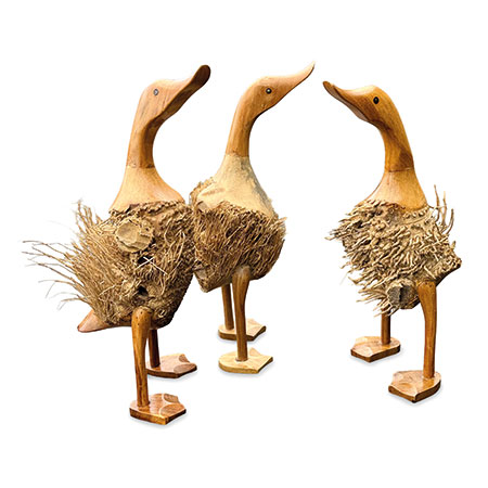 Indonesian artists use traditional hand-carving techniques to leave some of the bamboo root fibres exposed, giving our set of 3 ducks some fuzzy feathers. Supplied as a set of 3 for you to price invidually or as a group. Also available as a set of 3 smooth ducks.
